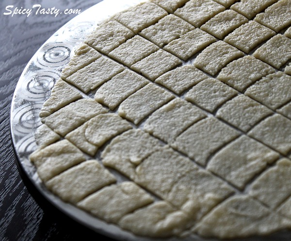 Cut the chapathis into small rectangles. Cut horizontal lines and then vertical lines- Deep fry it in oil until they are slightly brown.