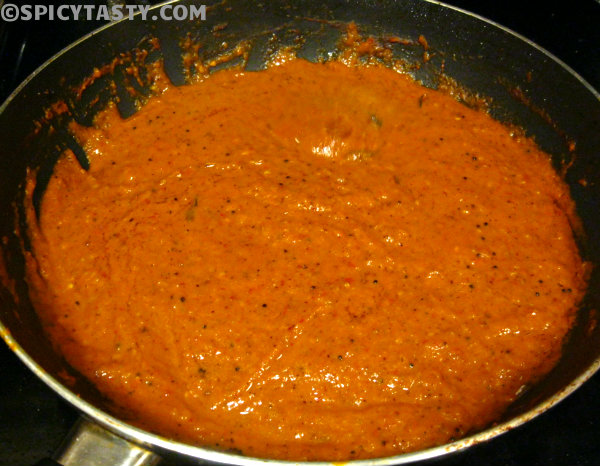 - Grind tomatoes and add it to the mixture and cook over medium heat by adding the rest of the oil slowly and stirring every 5 minutes.